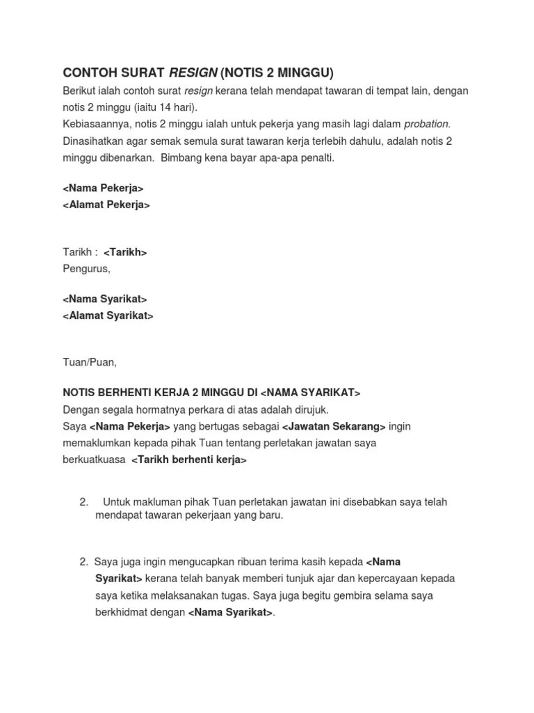 Berikut contoh notis berhenti kerja sebulan, 24 jam, 2 minggu dan seminggu. 4 contoh surat berhenti kerja ikut situasi, notis 24 jam, 2 minggu, sebulan & versi bm. Kalau nak minta kerja, mestilah beradab dan kena ikut piawaian yang . Contoh surat berhenti kerja (bm), koleksi surat perletakan jawatan resignation letter terbaik notis kerja 24 jam & notis sebulan. Selalunya, notis untuk berhenti kerja ialah. Surat perletakan jawatan notis 24 jam & sebulan dalam bahasa melayu/ english bm bi. Syarikat contoh surat berhenti kerja dari majikan kepada pekerja . Contoh surat rasmi berhenti kerja bahasa melayu dan bahasa inggeris. Perkongsian surat resignation letter notis sebulan dan 24 jam pelbagai alasan berhenti. Jadi, boleh ikuti contoh surat perletakan jawatan ini. Sebelum resign, hantar dulu surat kepada boss. Pastikan contoh surat resign yang anda hendak hantar selari degan surat perjanjian kontrak . Ini akan mengambil gaji anda sebulan, . Resignation latter atau surat rasmi berhenti kerja notis sebulan, .